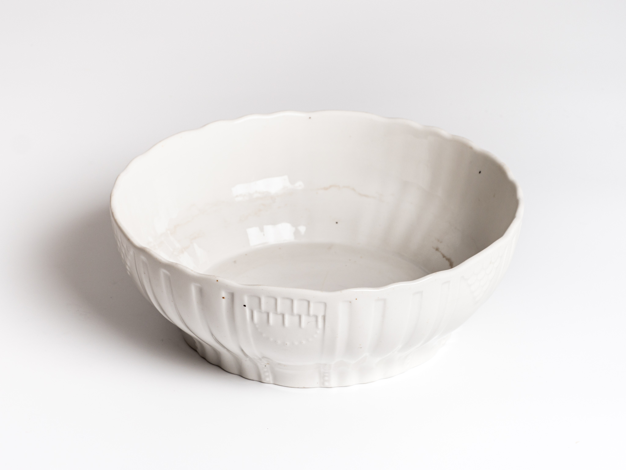 Fehér porcelán kistál, pöttyözött, csíkozott domború mintázattal a külsején. Alján védjegy: Zsolnay Pécs felirattal.Használata paraszti háztartásban nem elterjedt.