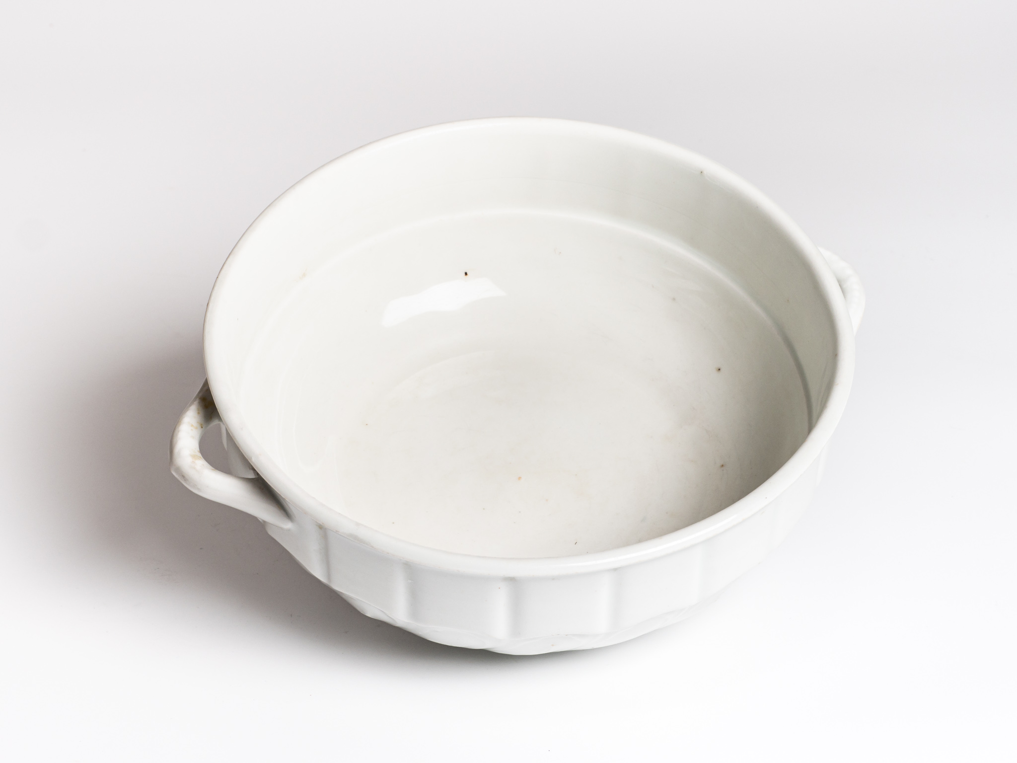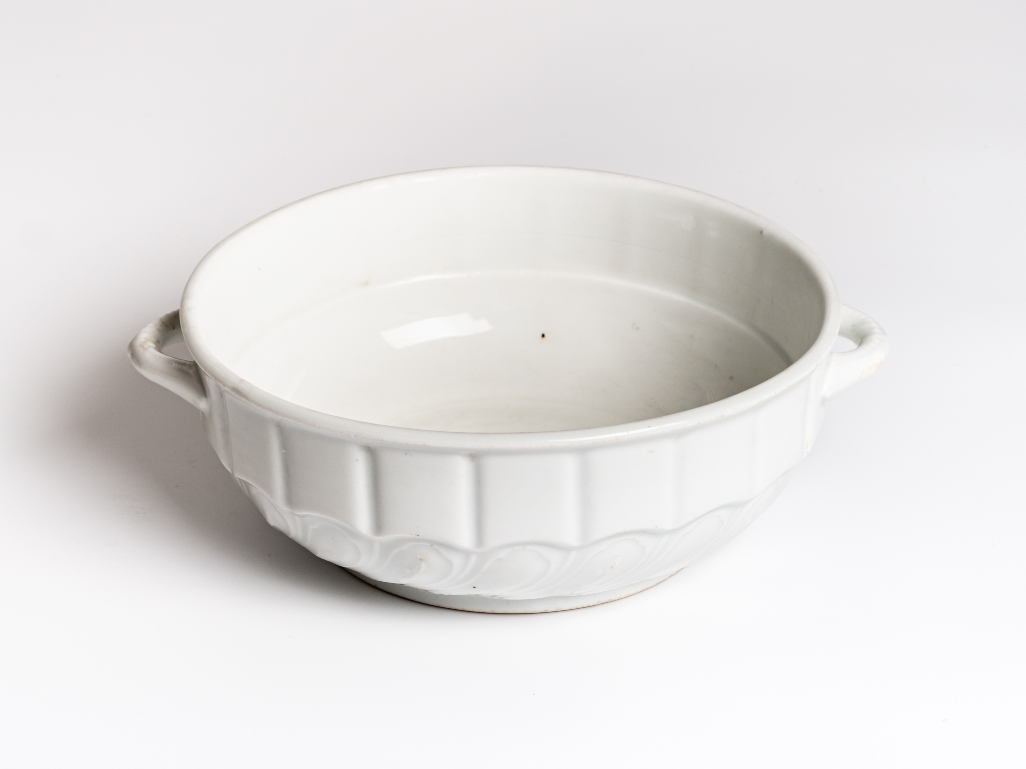 Füles, fehér porcelántál, hullámos, vonalas domború díszítéssel.
