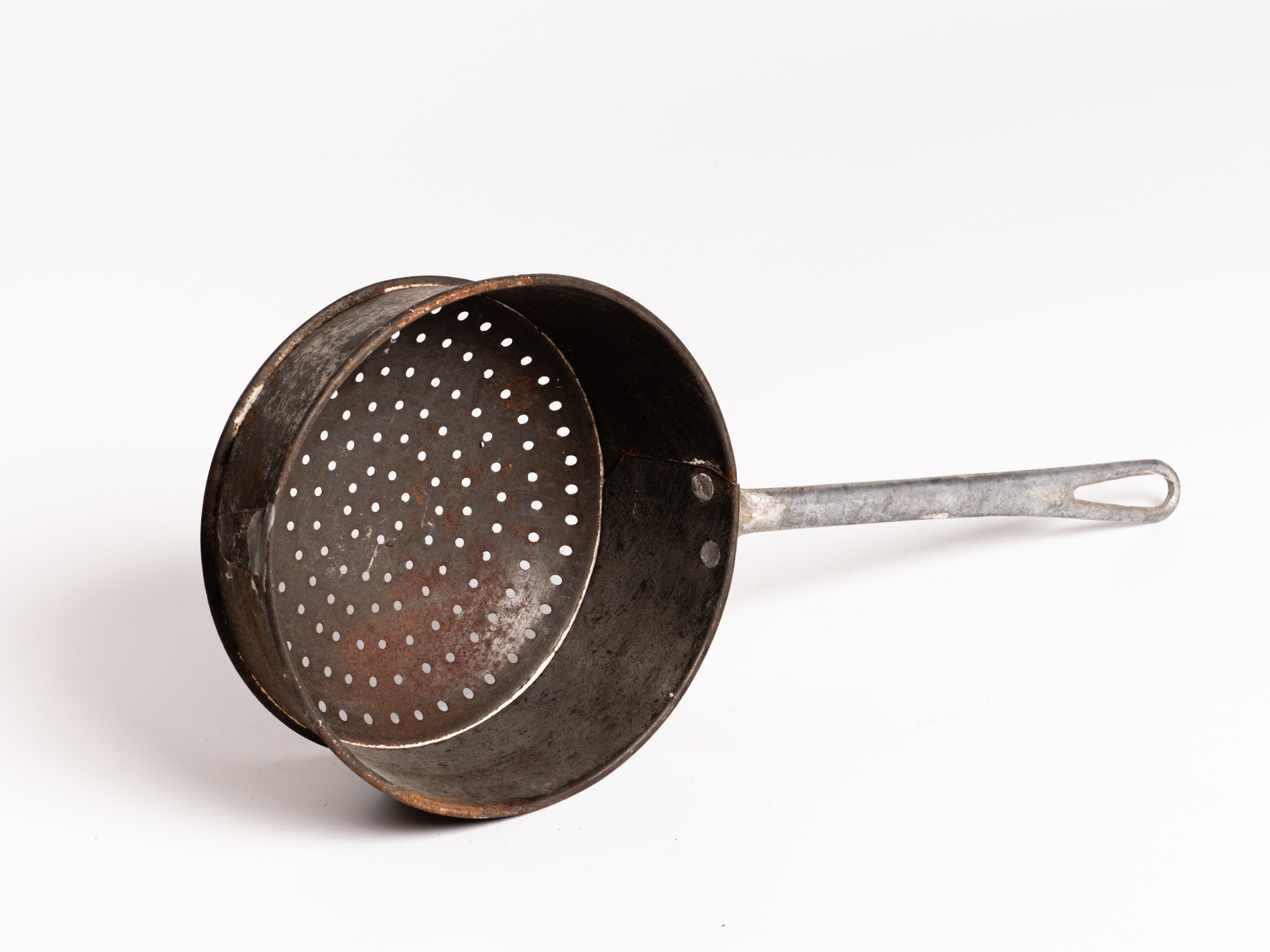 Lemezből készült tésztaszűrő nyéllel. Zománcozás nélkül.