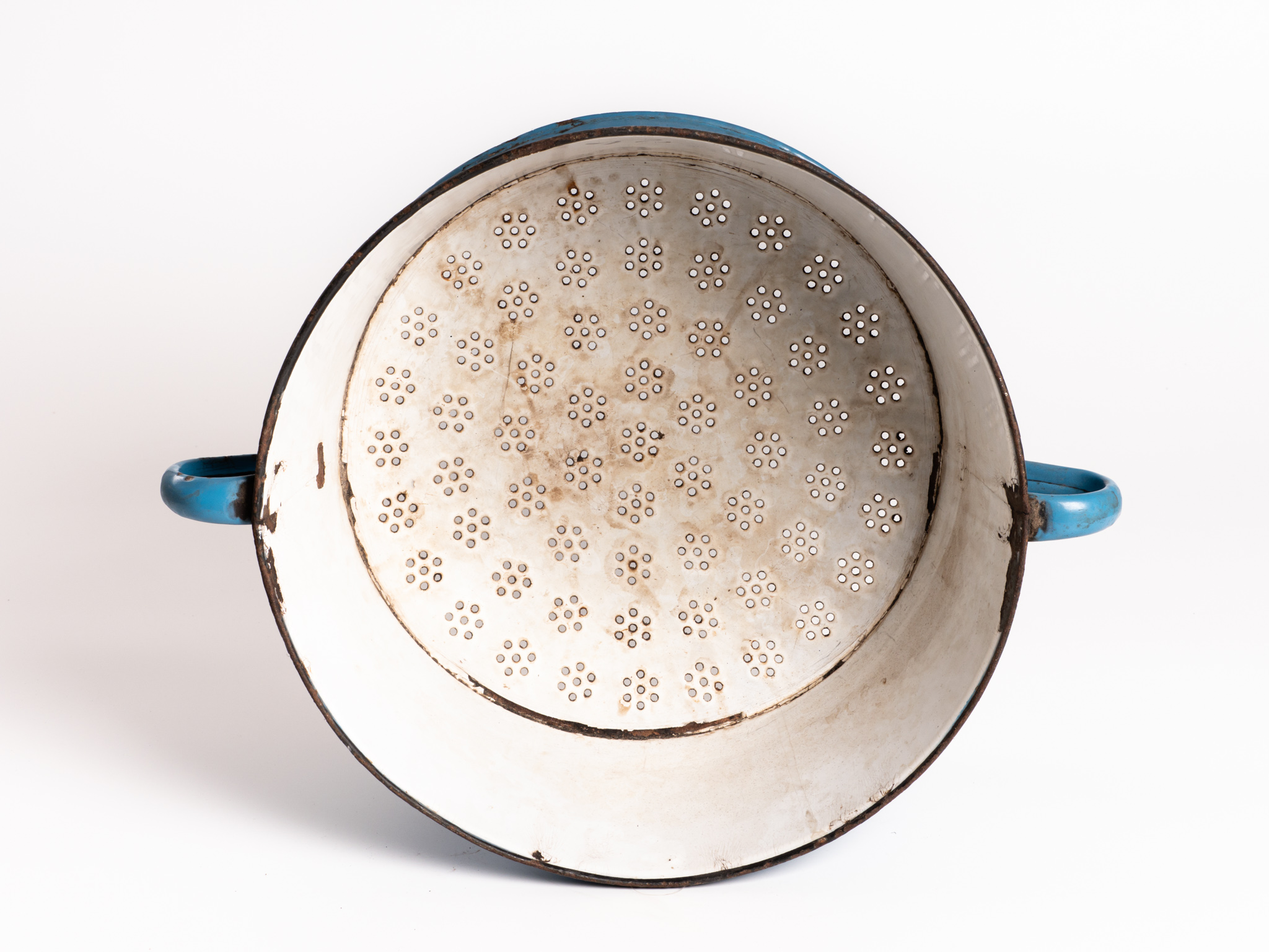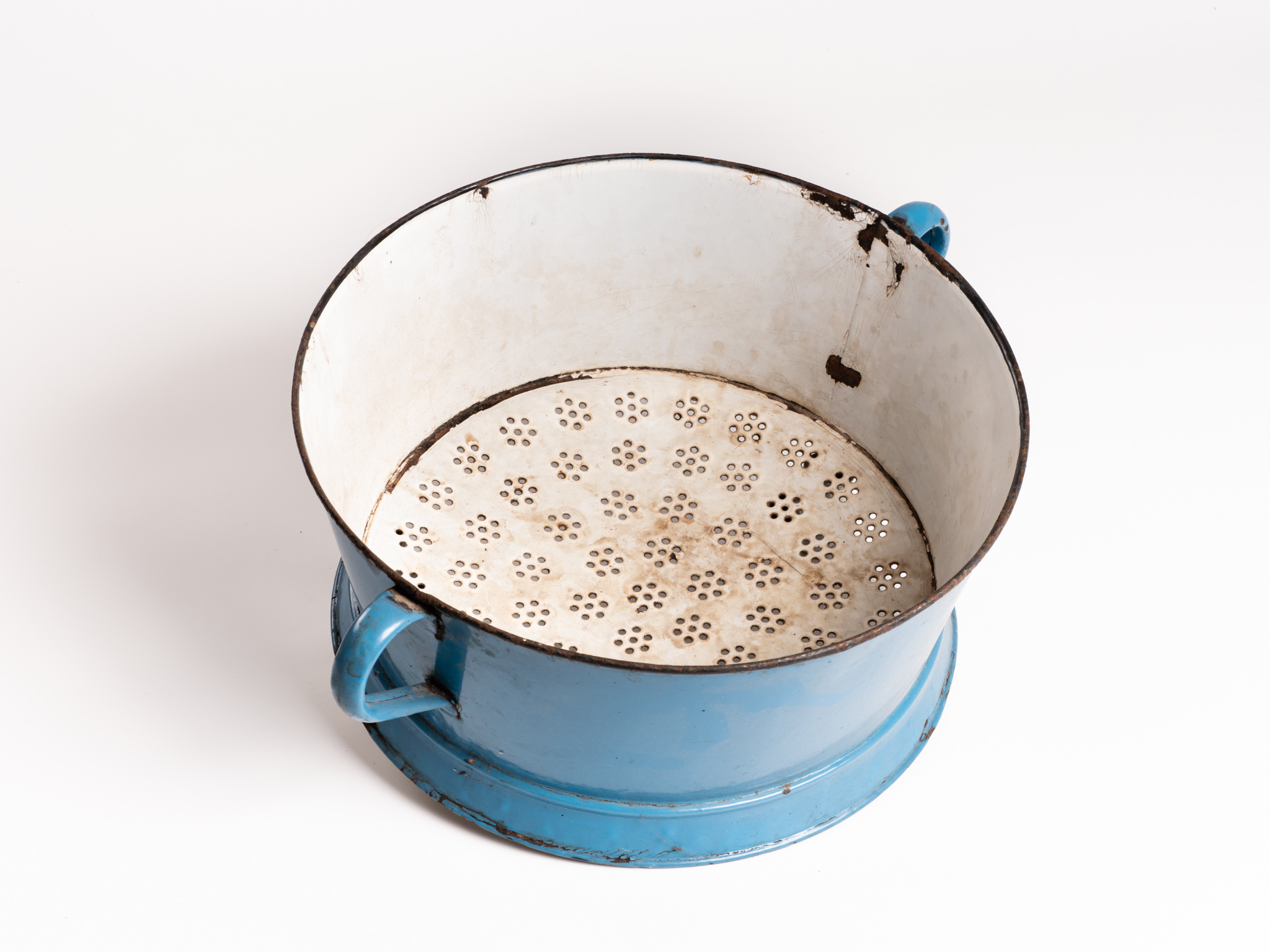 Kétfüles, kék zománcos bádog tésztaszűrő. Alján védjegy: Kőbánya. A Kőbányai Zománcárugyár 1951-től működött, később a Lampart Művek tagja lett.