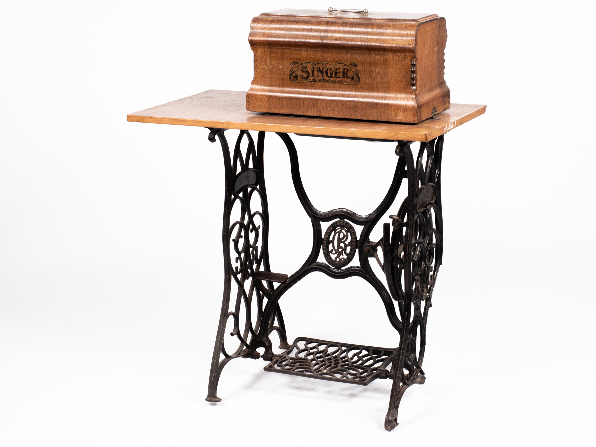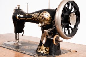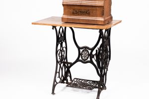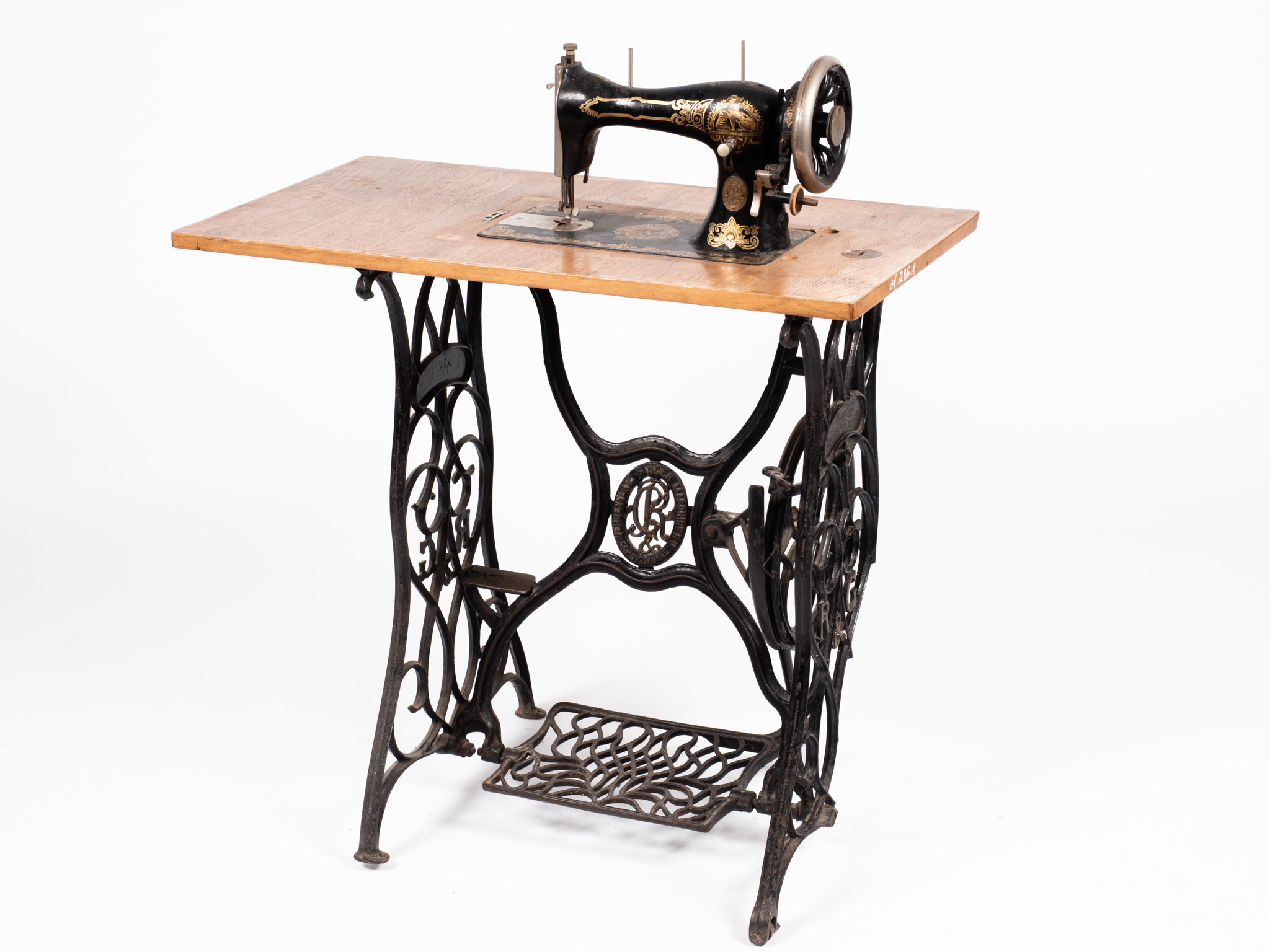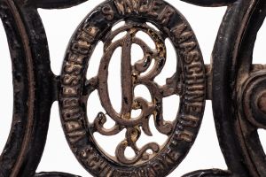 Pedálos, lábbal hajtós Rast & Gasser típusú varrógép, fekete öntöttvas lábbal,szecessziós stílusban, melyben védjegy szerepel: R&G jelzés és "Verbesserte Singer Maschine R. G. Schutzmarke felirat. A varrógép fekete - arany mintázatú (oroszlán-sas) szórt festéssel díszített, fából készült fedődobozzal. A varrógép- asztalon fölfestett 50 centiméter hosszú centi van. A kovácsoltvas lábakon a görgők a mozgatást segítették. Sorozatszám:330909 Egyik láb törött.