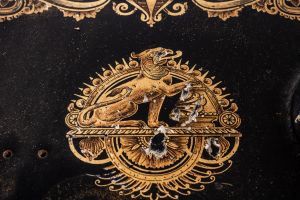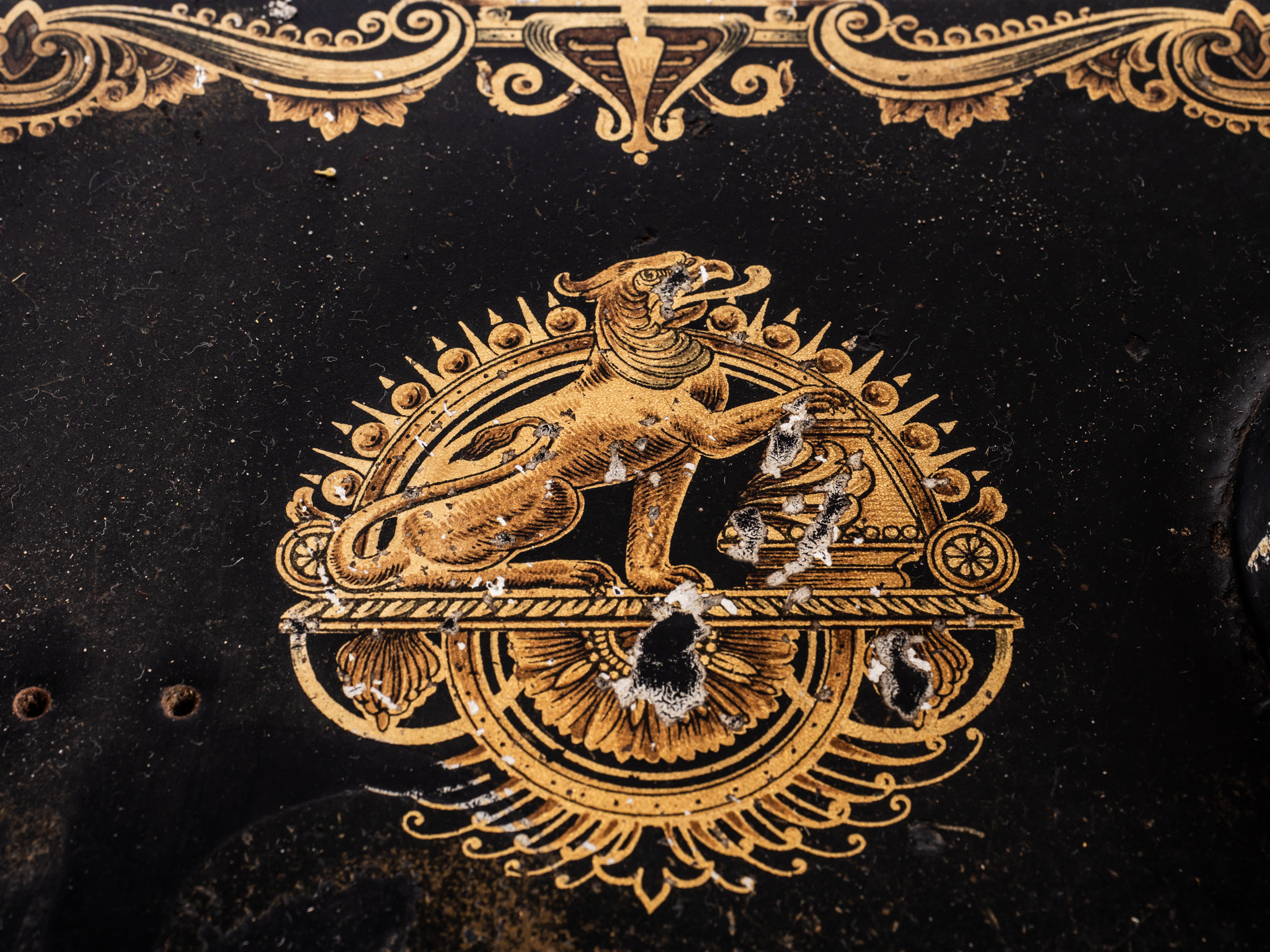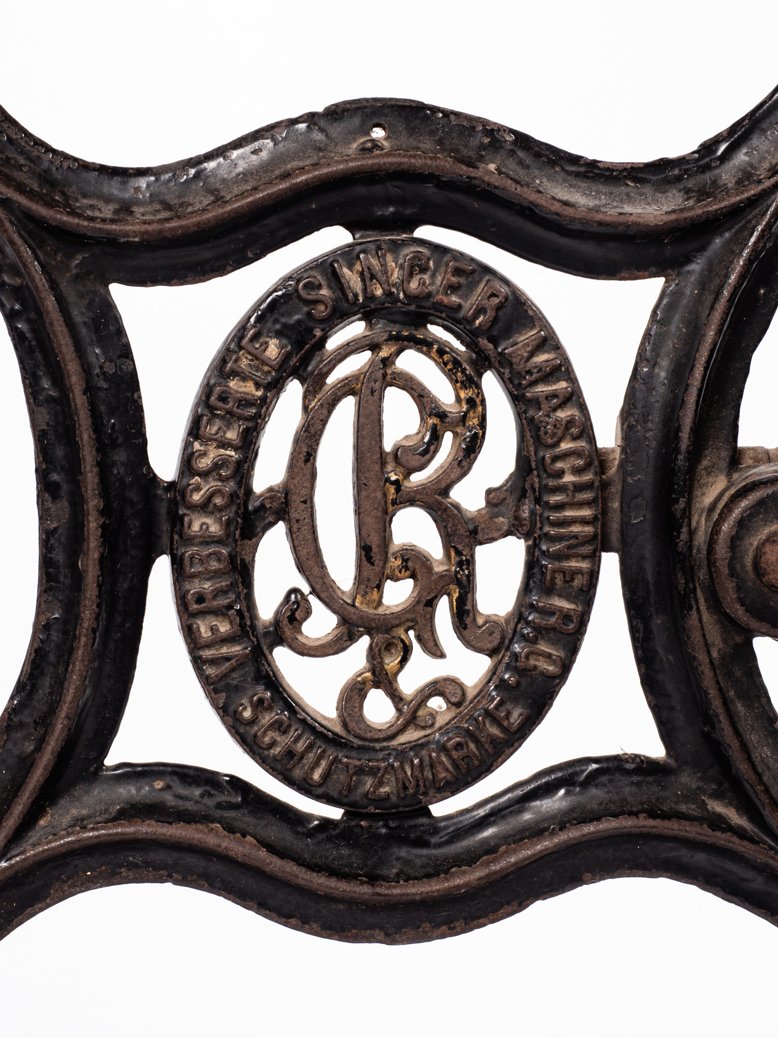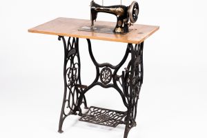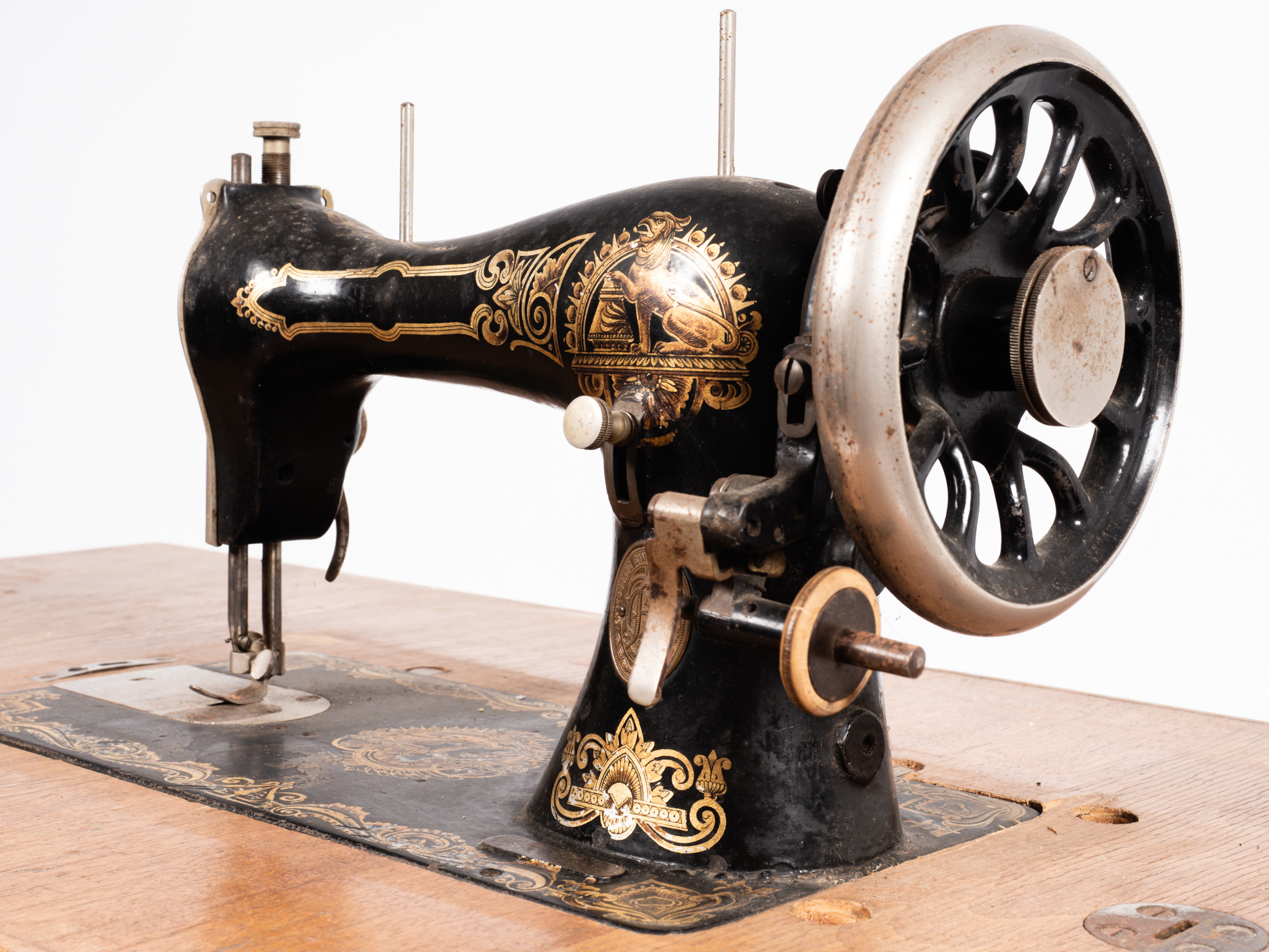 Pedálos, lábbal hajtós Rast & Gasser típusú varrógép, fekete öntöttvas lábbal,szecessziós stílusban, melyben védjegy szerepel: R&G jelzés és "Verbesserte Singer Maschine R. G. Schutzmarke felirat. A varrógép fekete - arany mintázatú (oroszlán-sas) szórt festéssel díszített, fából készült fedődobozzal. A varrógép- asztalon fölfestett 50 centiméter hosszú centi van. A kovácsoltvas lábakon a görgők a mozgatást segítették. Sorozatszám:330909 Egyik láb törött.