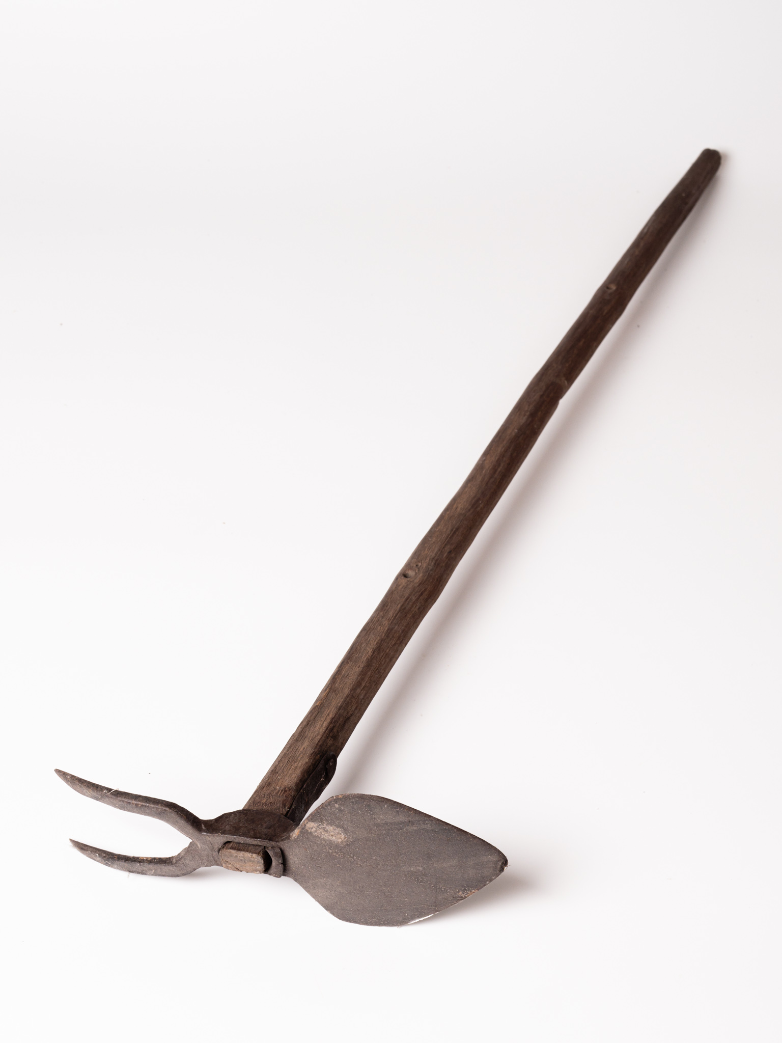Levél alakú, ellentétes oldalán villás kialakítású kiskapa fa nyéllel, amit a kötött talajok megműveléséhez használtak. Pl. szőlőművelés