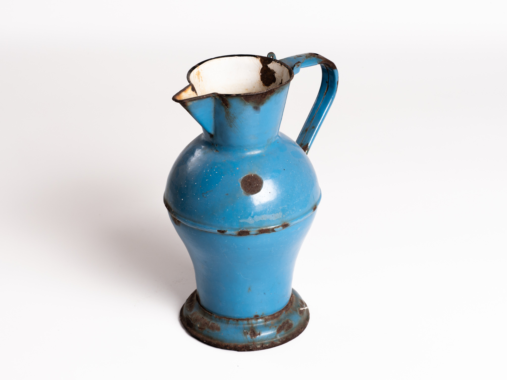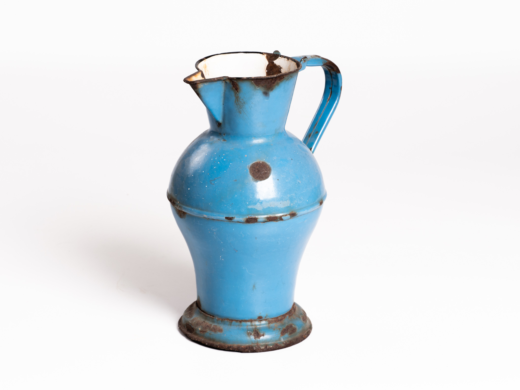 2 literes, kék zománcos bádog vizeskanna. Alján védjegy: LAMPART KŐBÁNYA. A fémárukat készítő gyár az I. világháború után kezdett zománcárut készíteni. Az államosítást követően Lampart Zománcárugyár Nemzeti Vállalat néven működött.