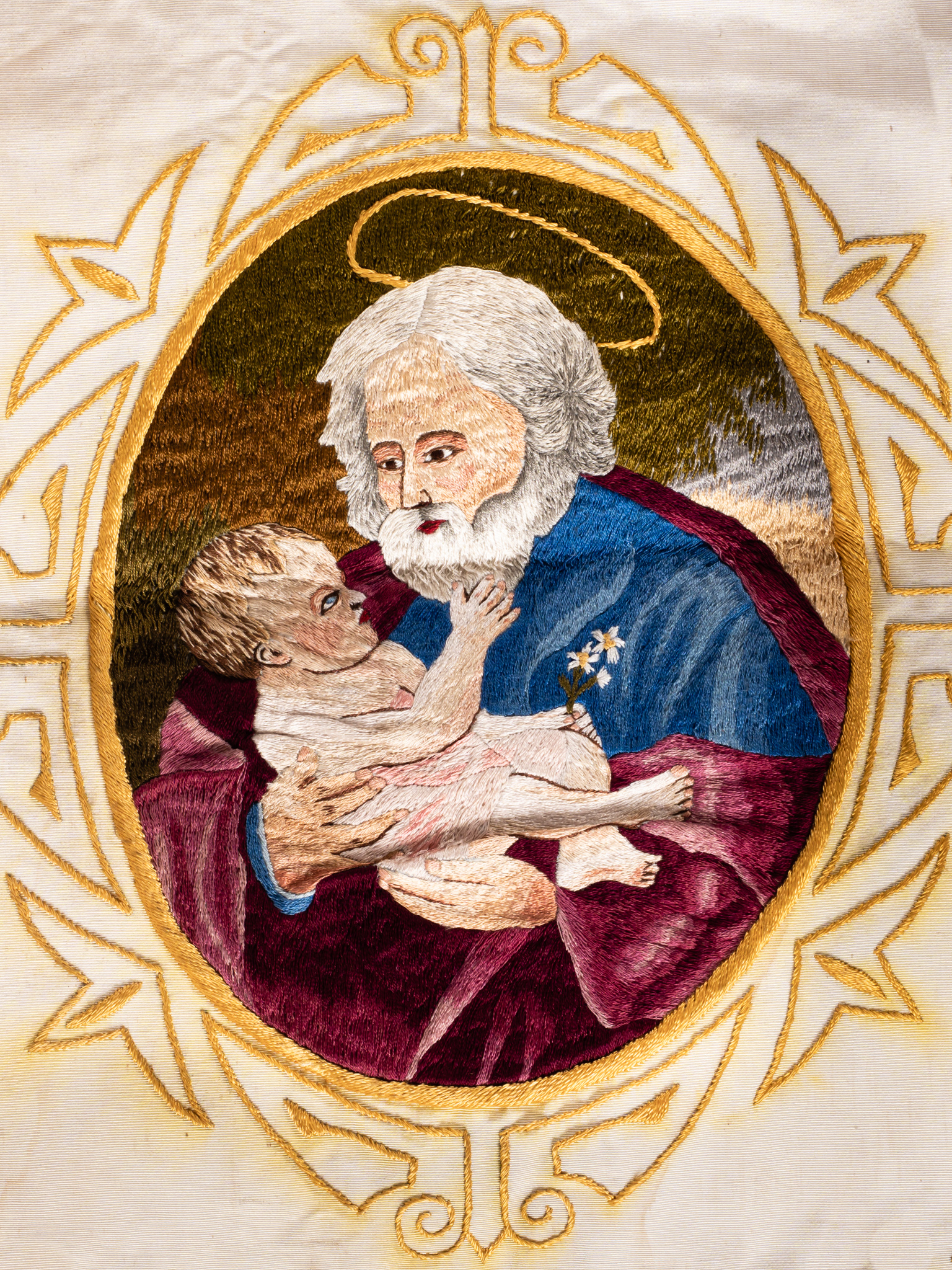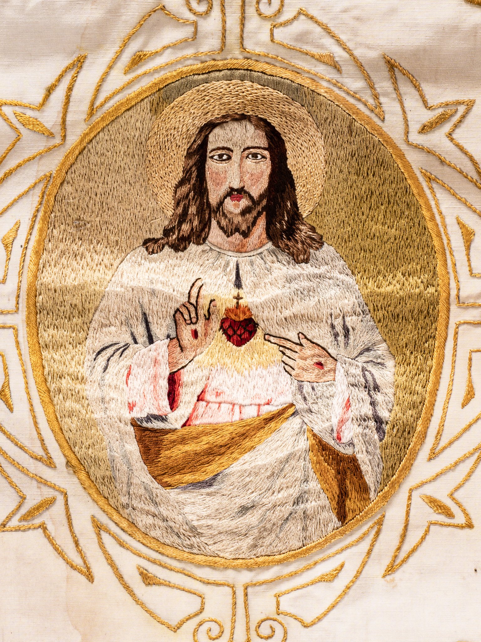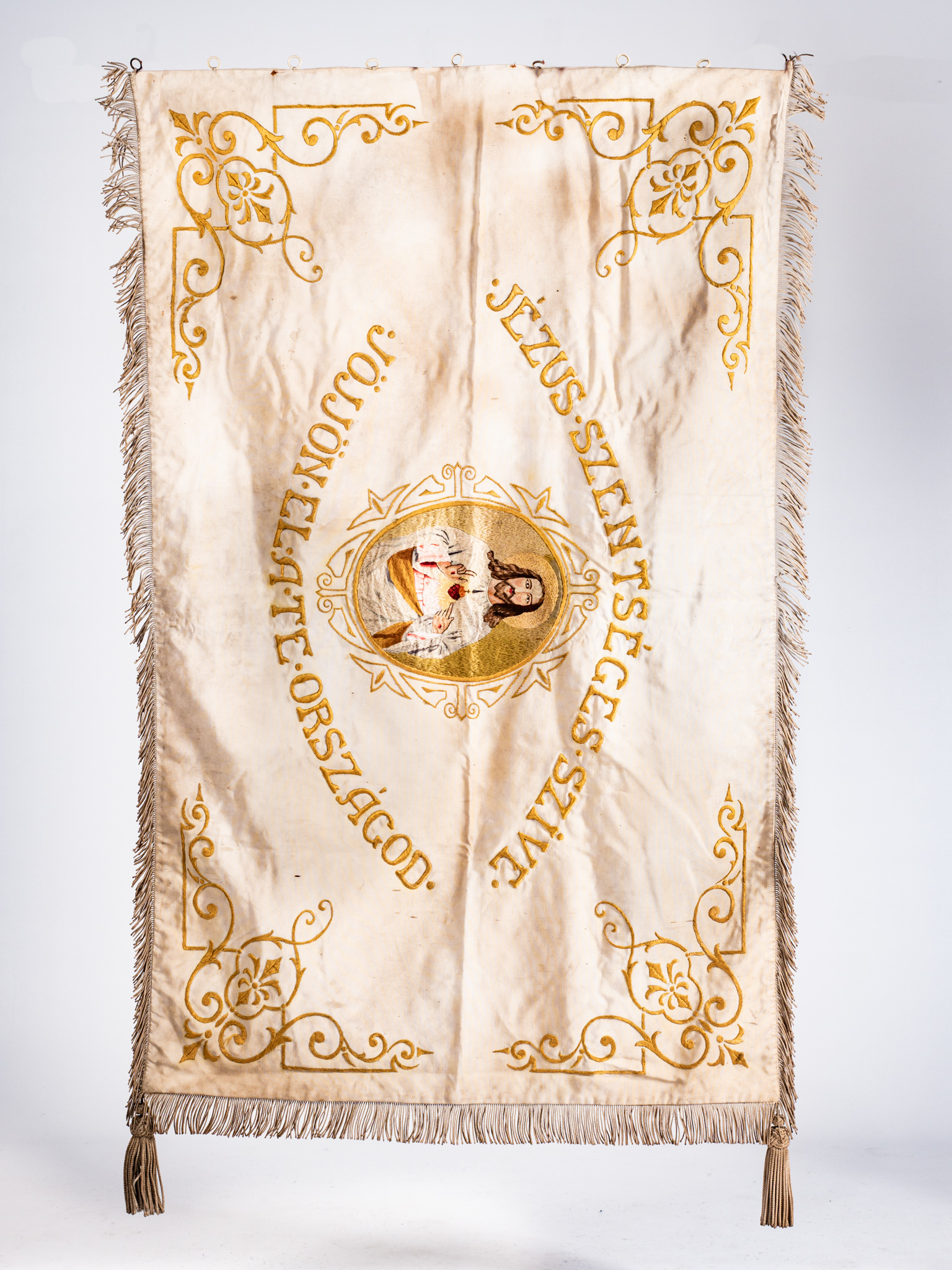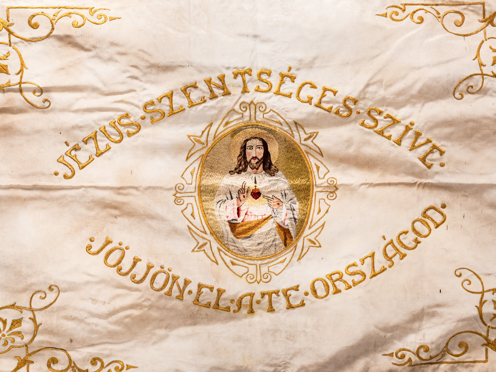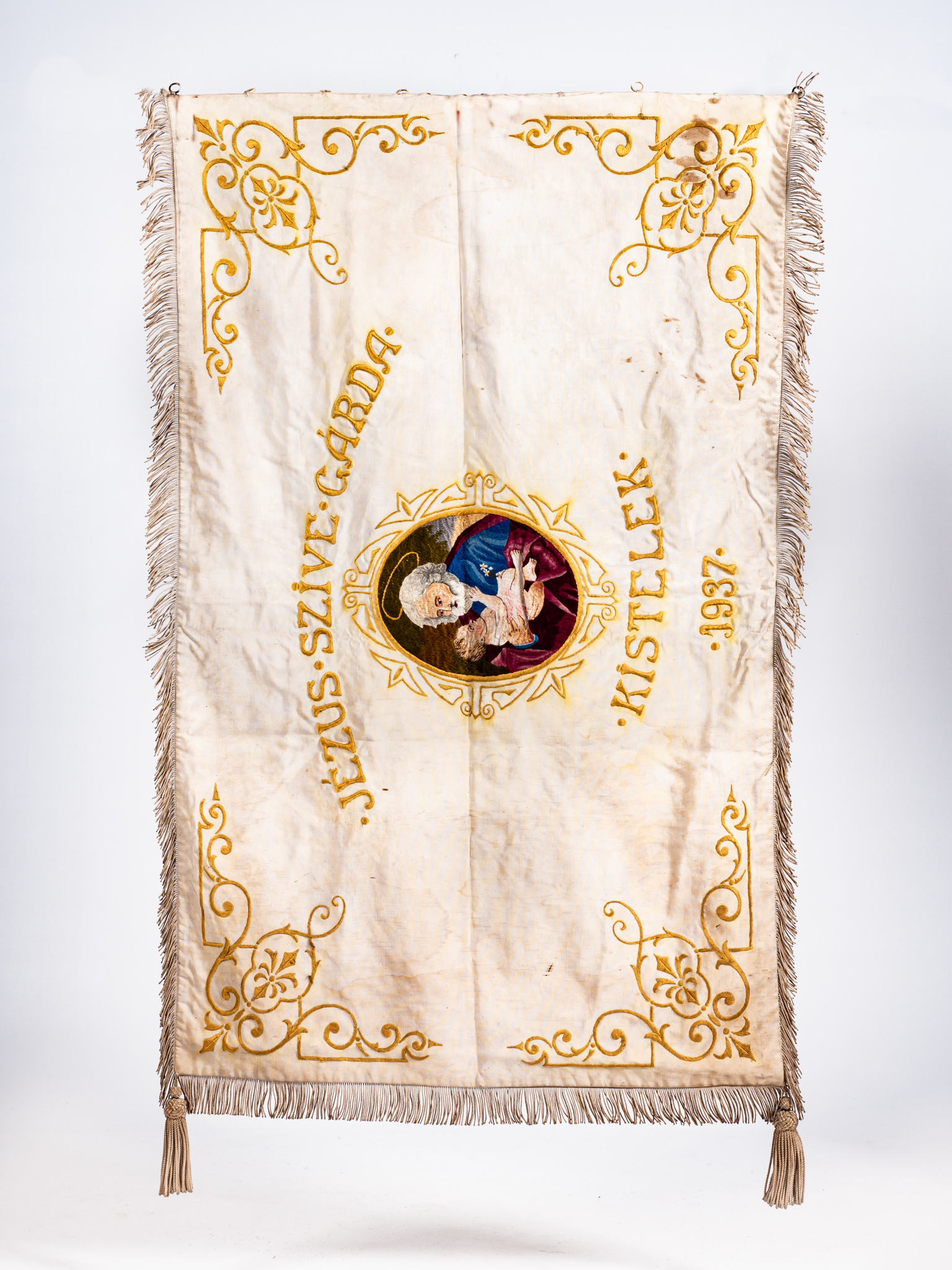 Fehér selyem alapon tűfestéssel díszített, rojtos, két bojttal ellátott vallásos társulati lobogó, felirattal. Egyik oldalon: Jézus Szíve Gárda Kistelek 1937. szöveg , gyermek Jézust ábrázoló tűfestéssel készült képpel. Másik oldalon: Jézus.Szentséges. Szive. JÖJJÖN. EL. A.TE.ORSZÁGOD felirattal, szívére mutató felnőtt Jézust ábrázoló tűfestéssel készült képpel.